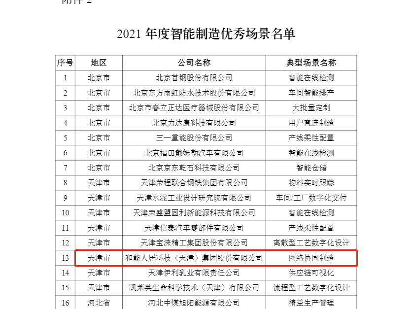 為貫徹落實《“十四五”智能制造發展規劃》,經省級有關部門推薦、專家評審、網上公示等程序,工業和信息化部、國家發展和改革委員會、財政部、國家市場監督管理總局聯合公布了《2021年度智能制造優秀場景名單》,和能人居科技集團網絡協同制造榮登榜單。